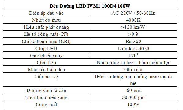 Thông số kỹ thuật Đèn Đường LED IVM1 100D4 100W